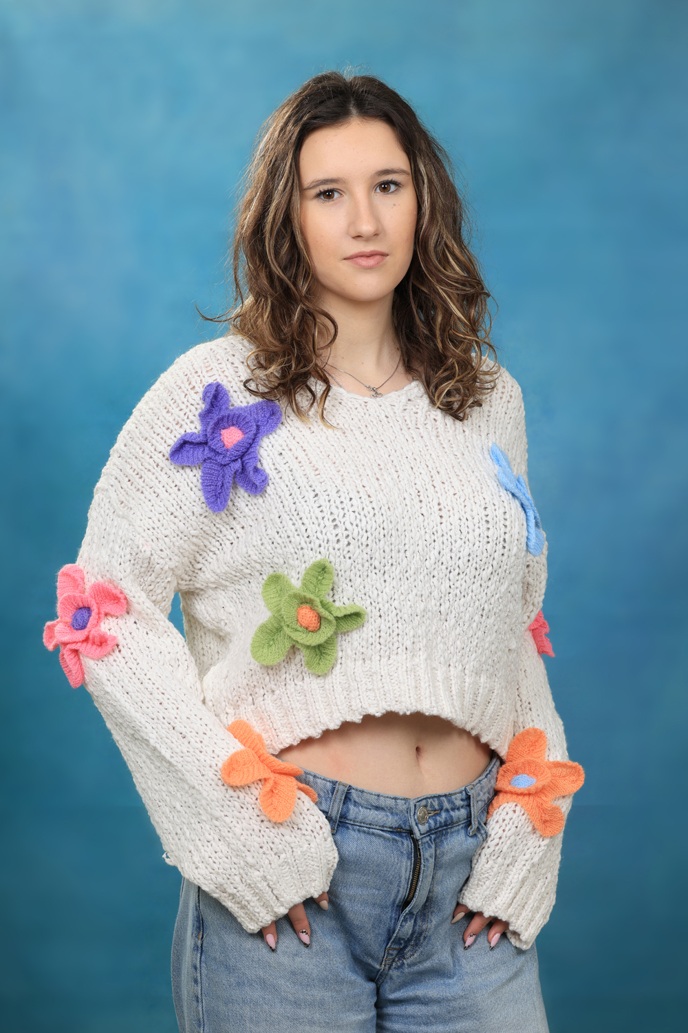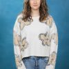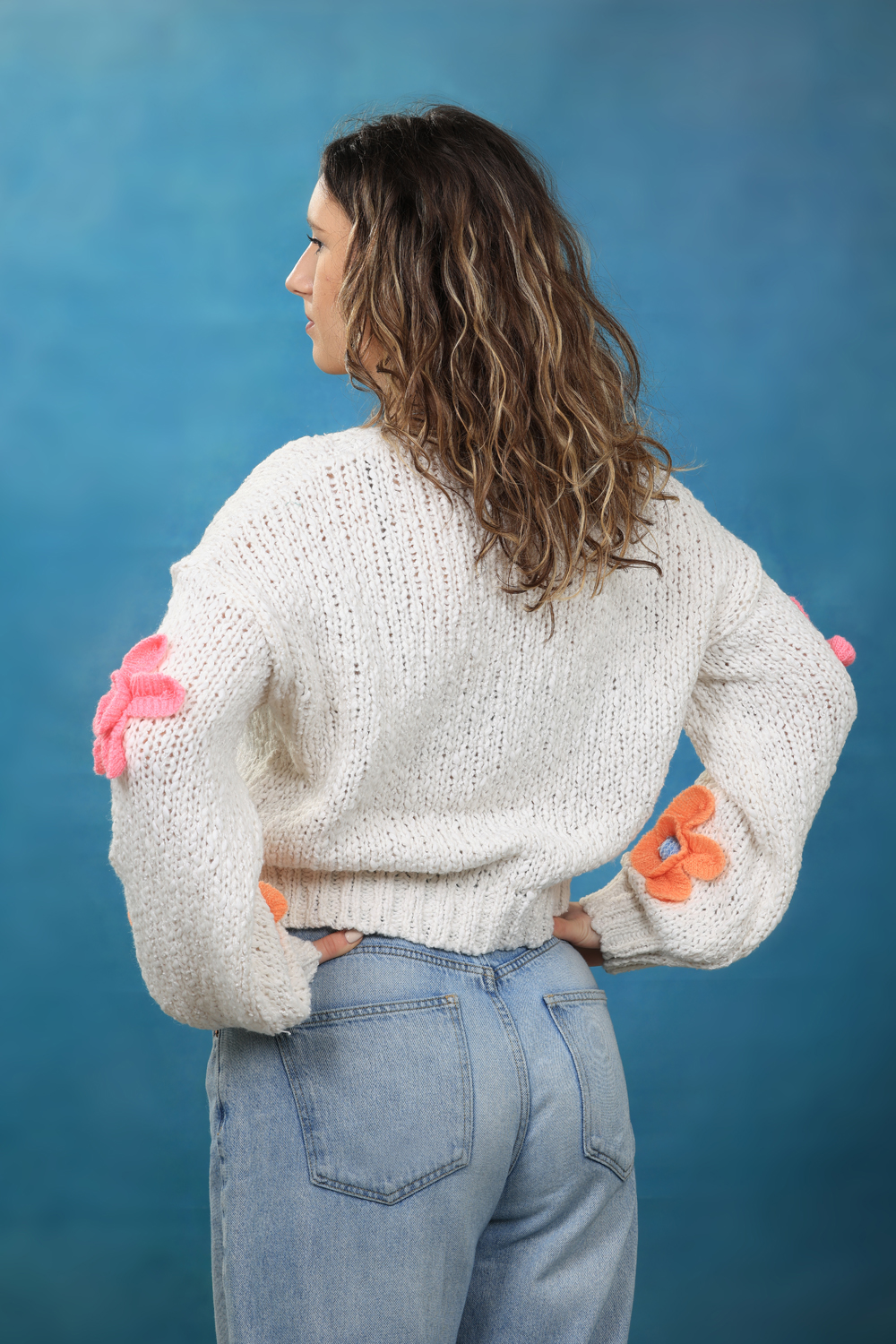 Бял дамски едро плетен пуловер допълнен с ефектни цветя и бод деколте