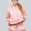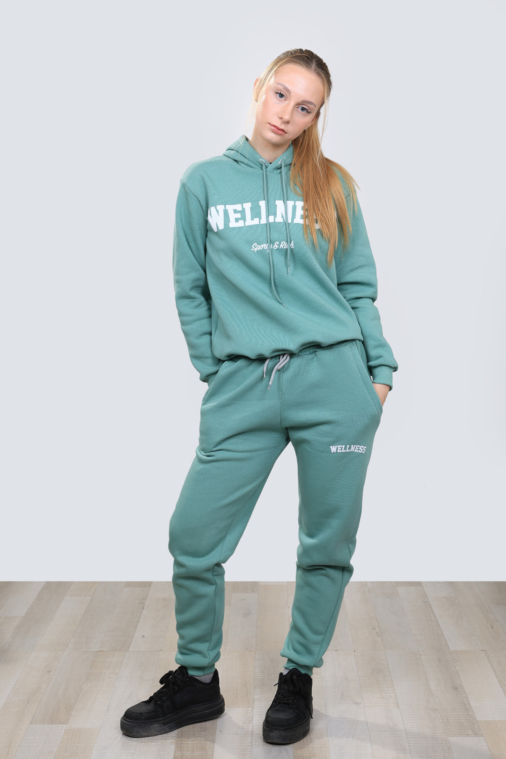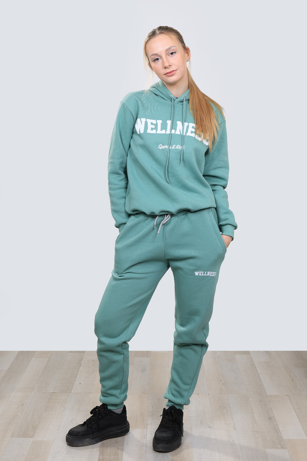 Ватиран дамски комплект който е от две части удобно долнище с маншети от еластичен плат и два джоба и горна част с качулка допълнени с ефектни надписи в бяло Комплекта е изработен от висококачествен памучен плат подходящ за есента или зимата