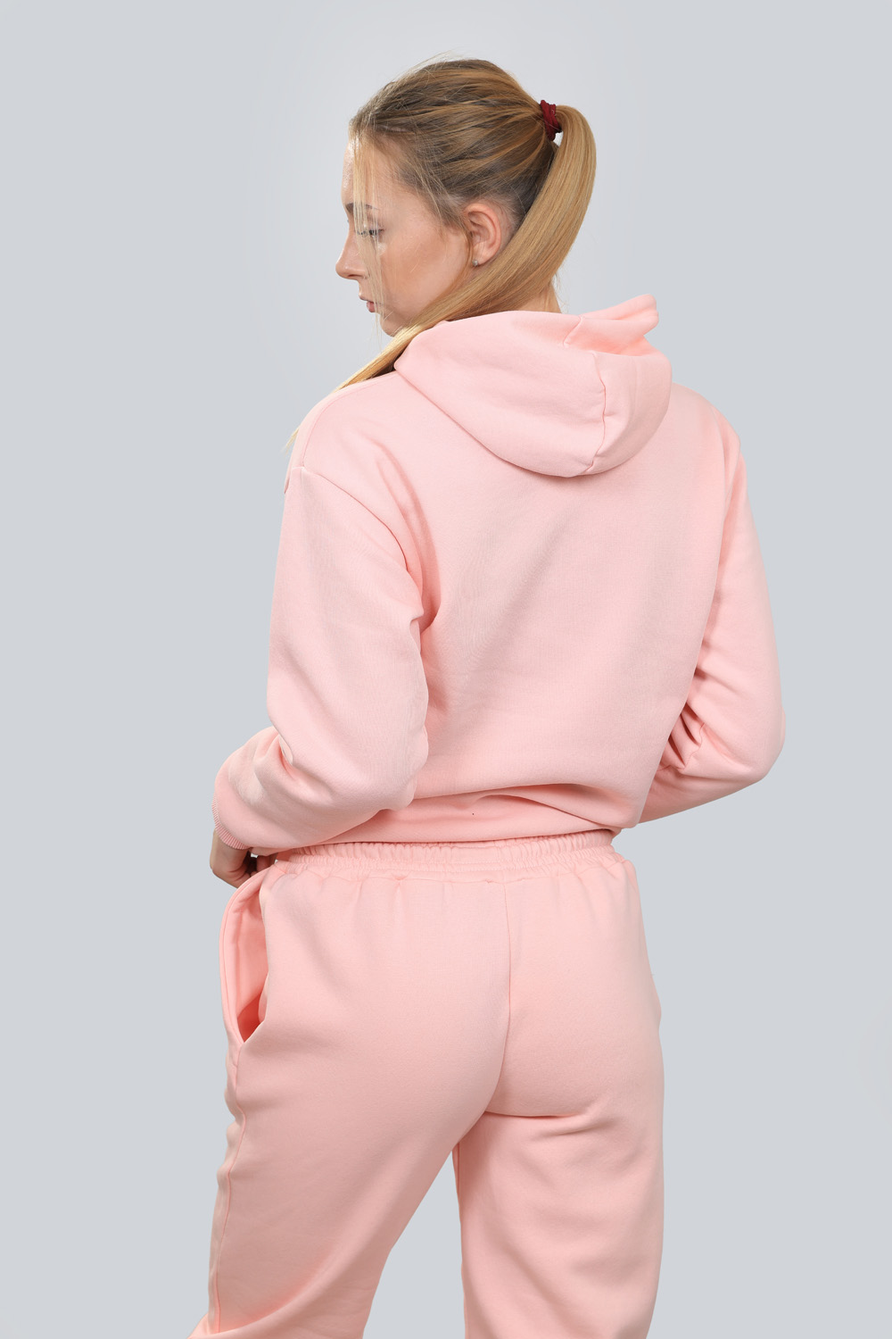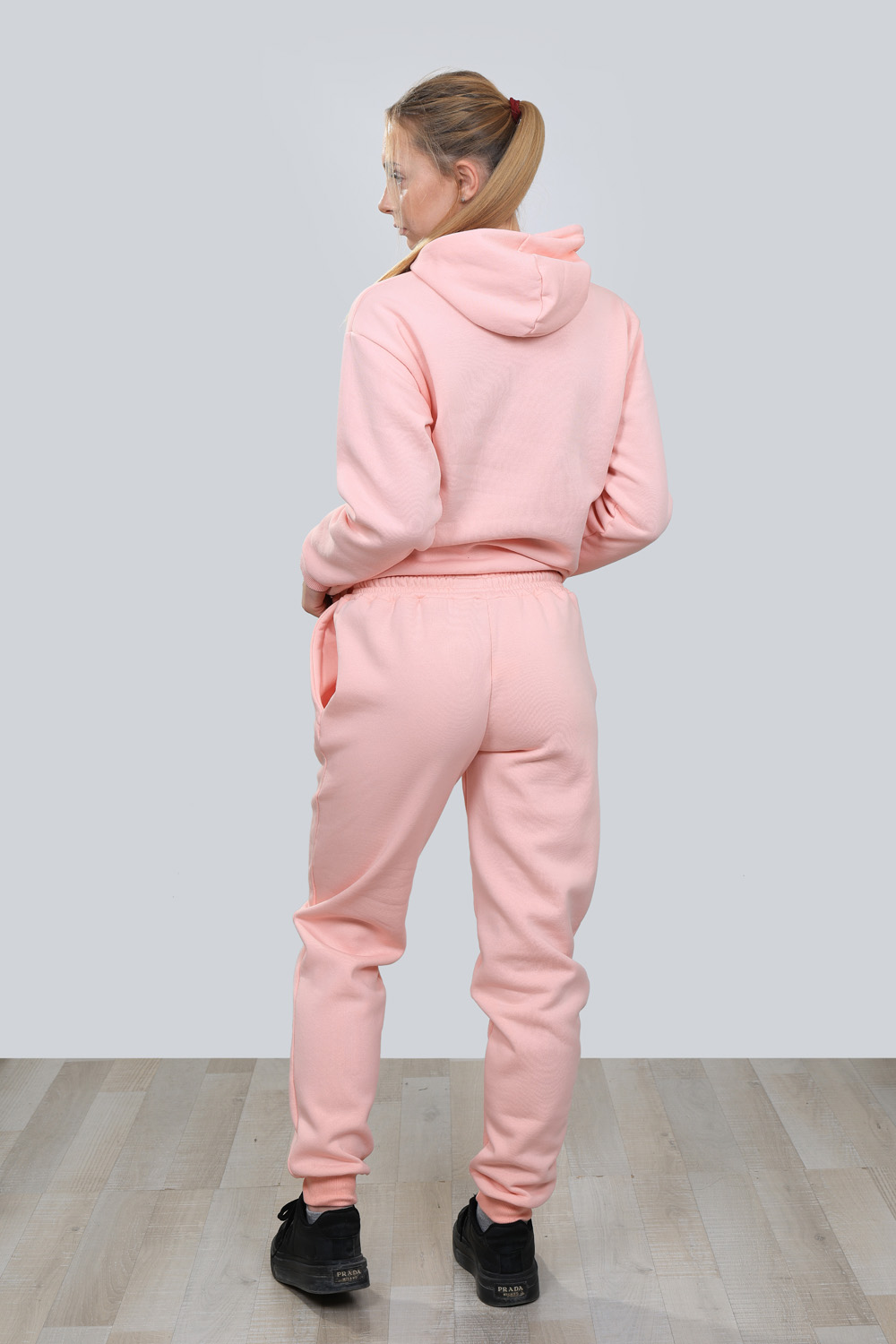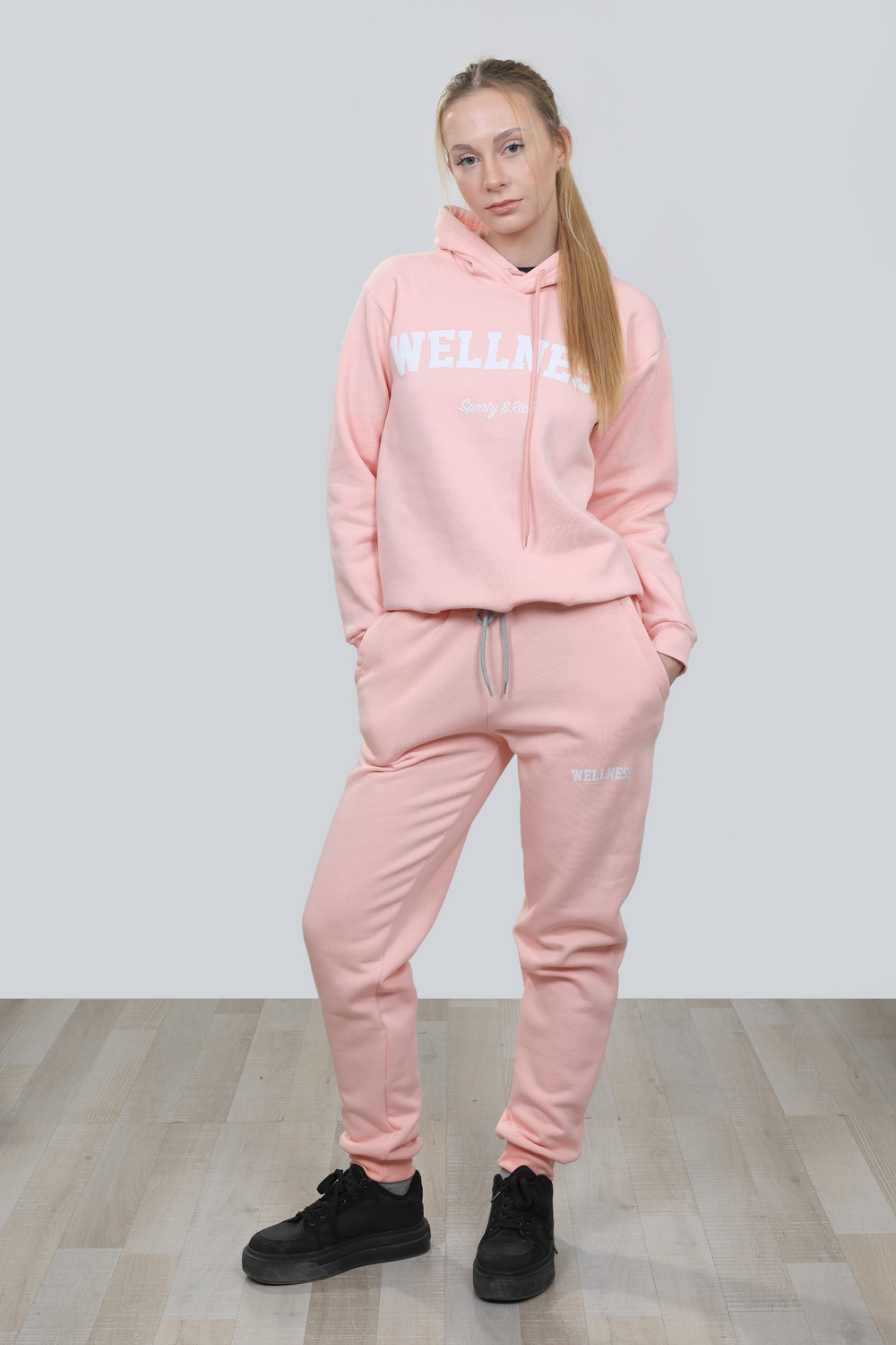 Ватиран дамски комплект който е от две части удобно долнище с маншети от еластичен плат и два джоба и горна част с качулка допълнени с ефектни надписи в бяло Комплекта е изработен от висококачествен памучен плат подходящ за есента или зимата