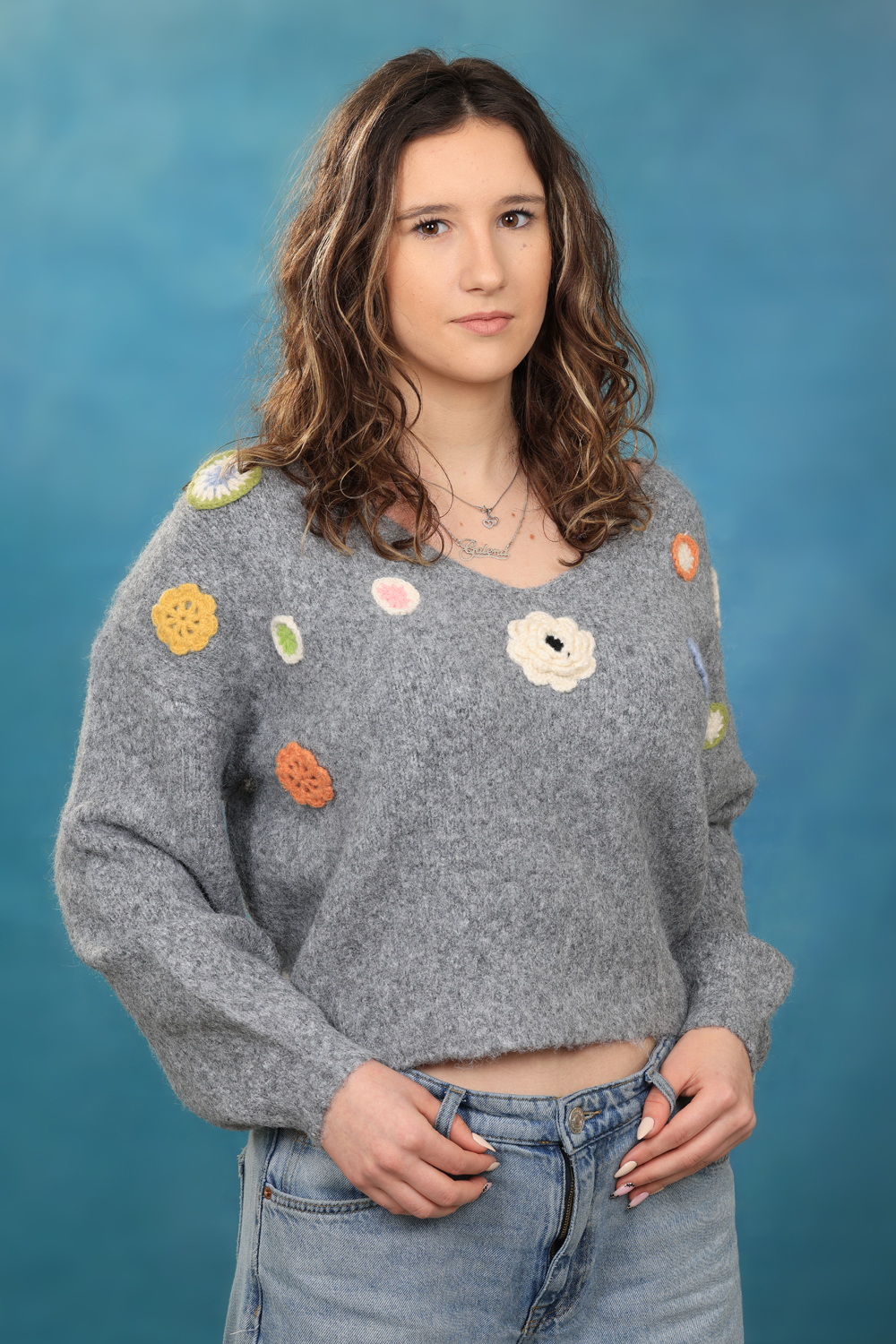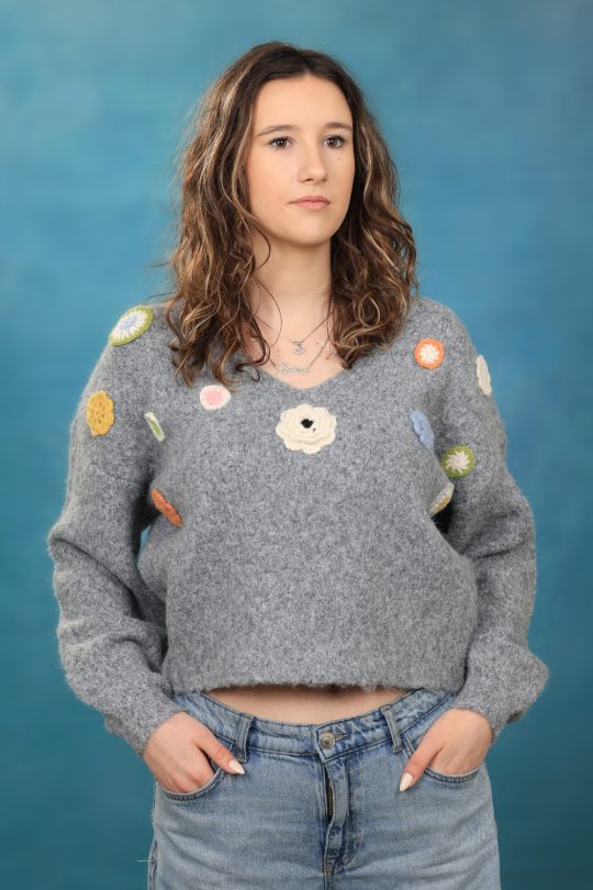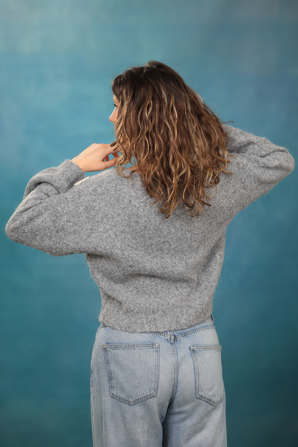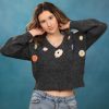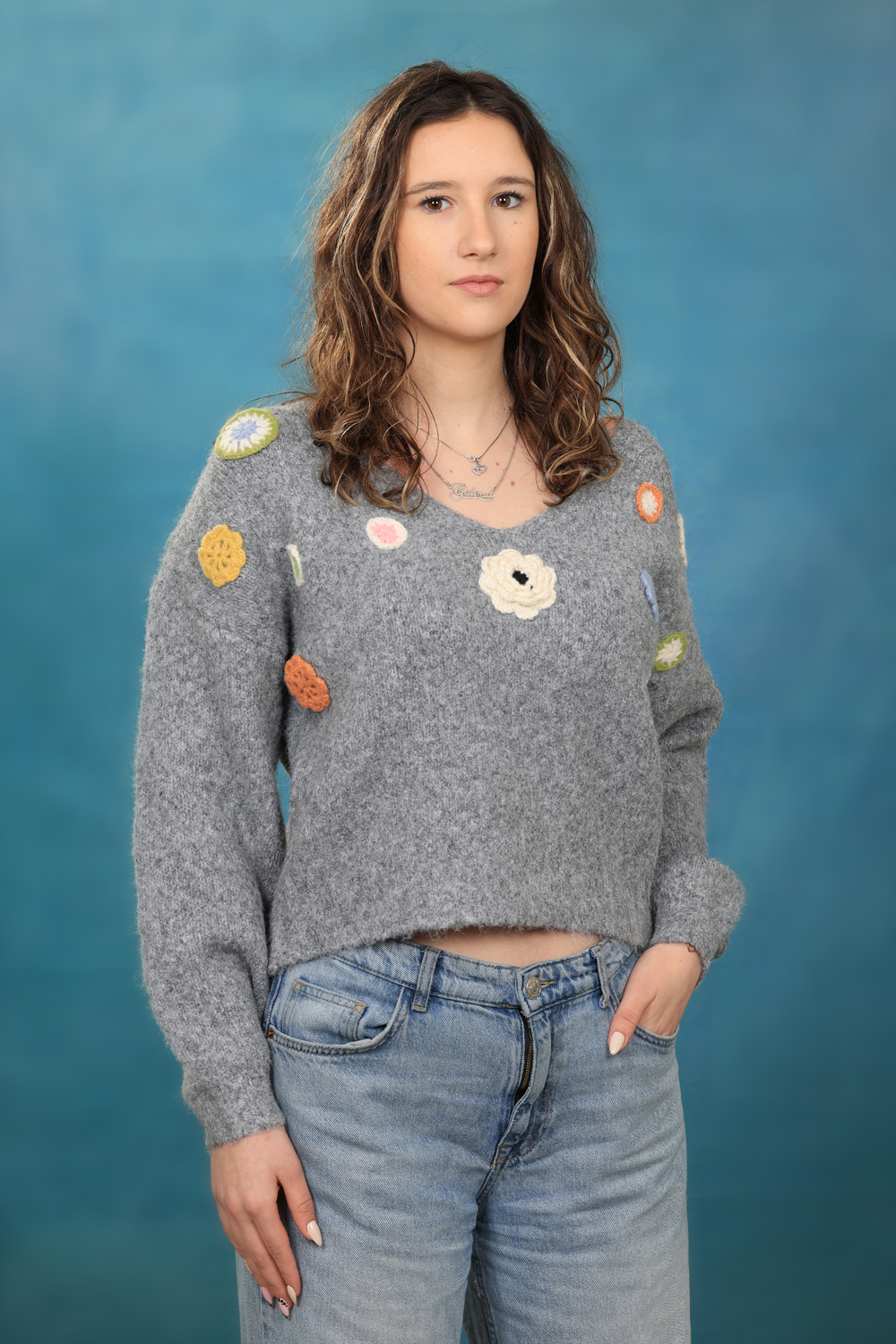 Сив дамски пуловер с остро деколте допълнен с шарени кръгчета на предницата и ръкавите